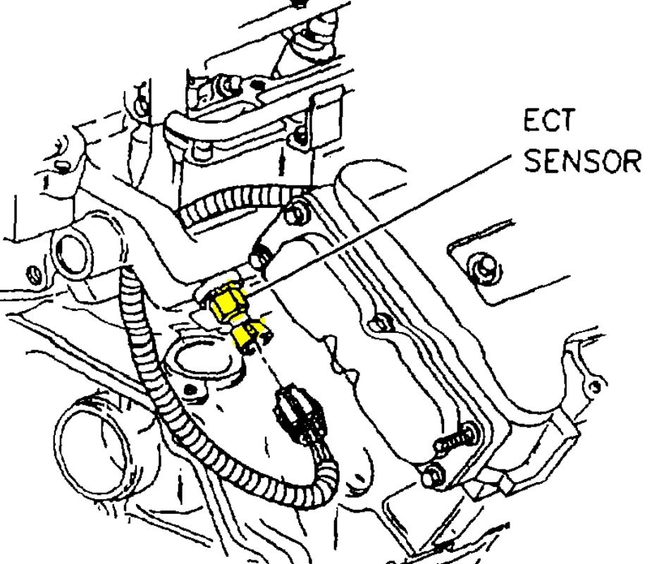 The ECT is located in the rear of the engine in the coolant tube just above the bell housing flange on the block. You can see it if you look in the area between the exhaust crossover the intake manifold and the cylinder head. To get to it for replacement you need to remove the air intake duct then the MAF sensor. Next you may need to remove the exhaust crossover. I have been 50/50 on that, some have enough room to snake an extension and socket in there to get the sensor, others are built with not enough room. Next you need to drain the coolant below the sensors level and disconnect it and remove it. Reverse the process to install a new one.