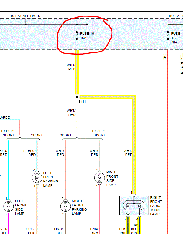 Now, the white wire with the red stripe is straight from the fuse. The blue with an orange stripe goes to the front electric module (FEM), and the black is ground. Make sure you have continuity to ground via the black wire. You will need a multi meter to check this.