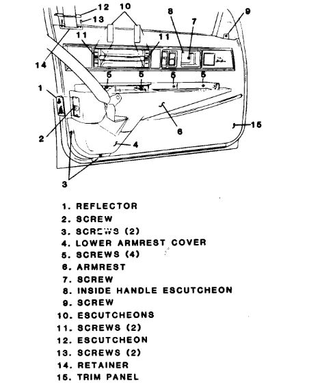 21. Trim panel (15), by disengaging fasteners on trim panel from holes in door inner panel using tool BT-7323 or equivalent between trim panel and door inner panel.