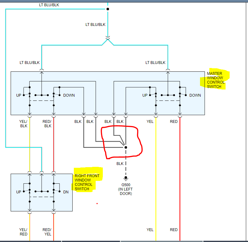 Let me know if that helps. Also, if you need help understanding what I said (I tried) LOL, let me know. What makes this confusing is the idea that power is always at the switches. What determines what a window motor does is based on the ground wire that is selected.