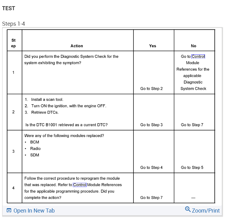 DTC B1001 is an indication that the restraints ID stored in both the BCM and the SDM do not match or that the VIN stored in the BCM does not match the VIN stored either in the SDM or in the radio. If any of the modules mentioned above were previously replaced, the replaced module needs to be reprogrammed for proper operation.