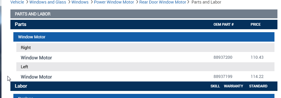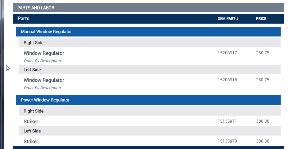 I assume you are looking for the motor and regulator system? There are a number of other components like trim and weatherstripping but I provided the info on the motor and regulator system. Let me know what other parts you may need and we can get them as well. Unfortunately they don't have an "exploded view" of the door showing every component. We would need to go through the door one piece at a time. Thanks