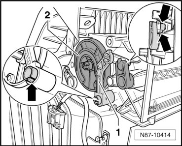 - Open the retainers - arrows - on the adjusting lever - 1 -.