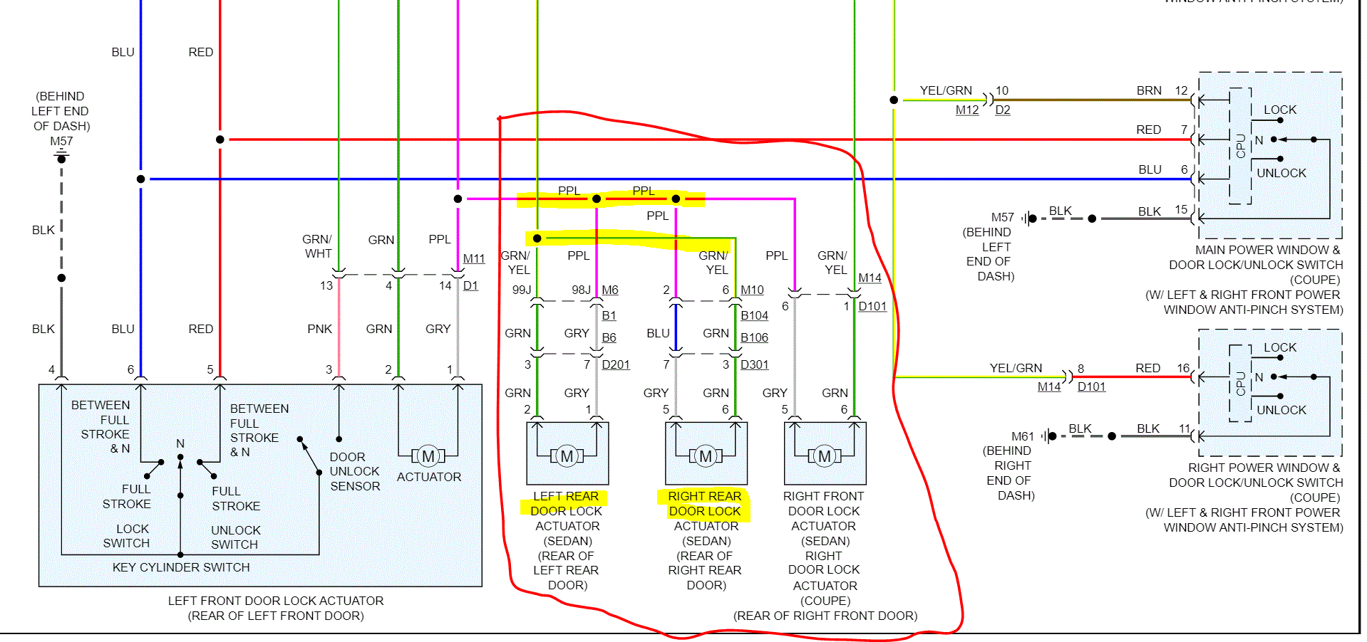 The last pic is a portion of the body control module, which supplies power to the front doors and the rear. So, if the front works, I suspect either there is a break in the wiring at the rear or the actuators are bad.