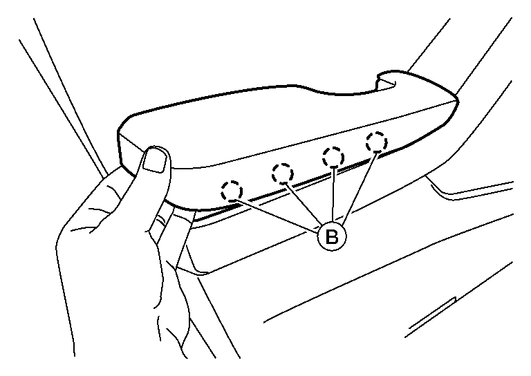 b.Gently lift up on the rear of the armrest finisher to release the inboard pawls (B).