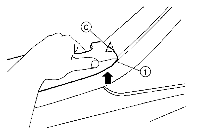 c.Support the armrest finisher at the pull grip part of the armrest finisher while gently lifting the armrest finisher straight up to release the pull grip pawls and clip (C), then remove the armrest finisher (1).
