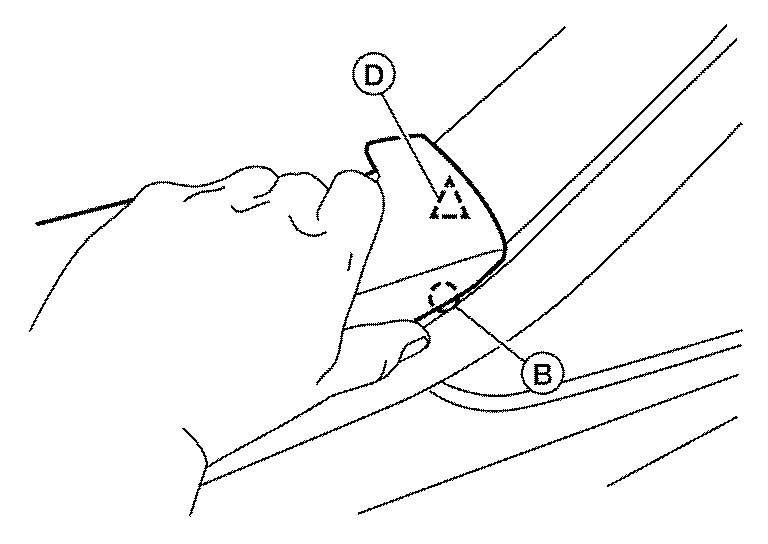 1.Align and press the armrest finisher clip (D) and pawl (B), into the front door finisher.