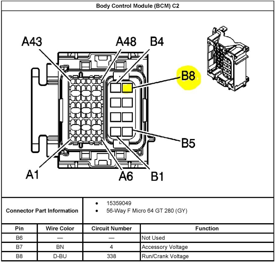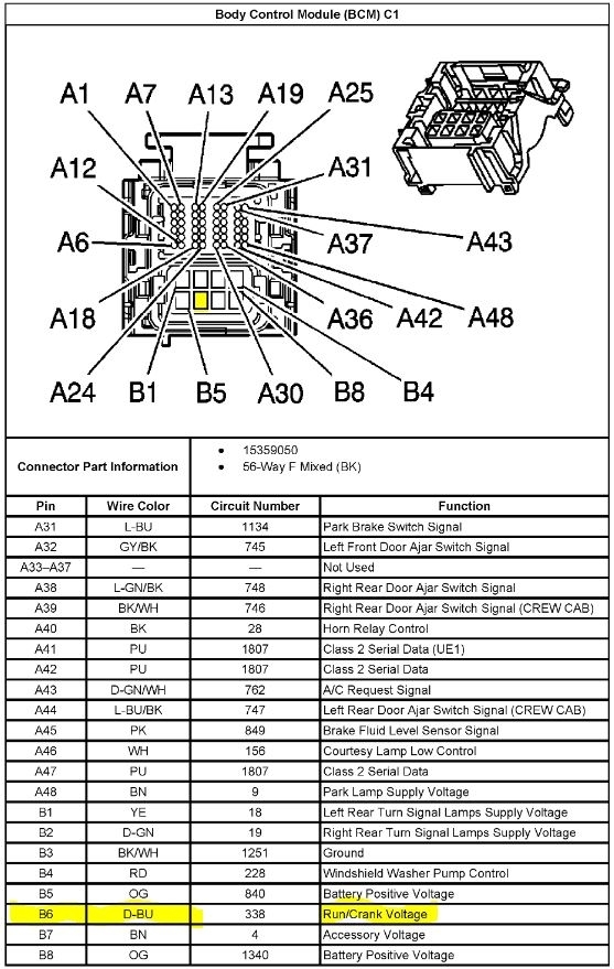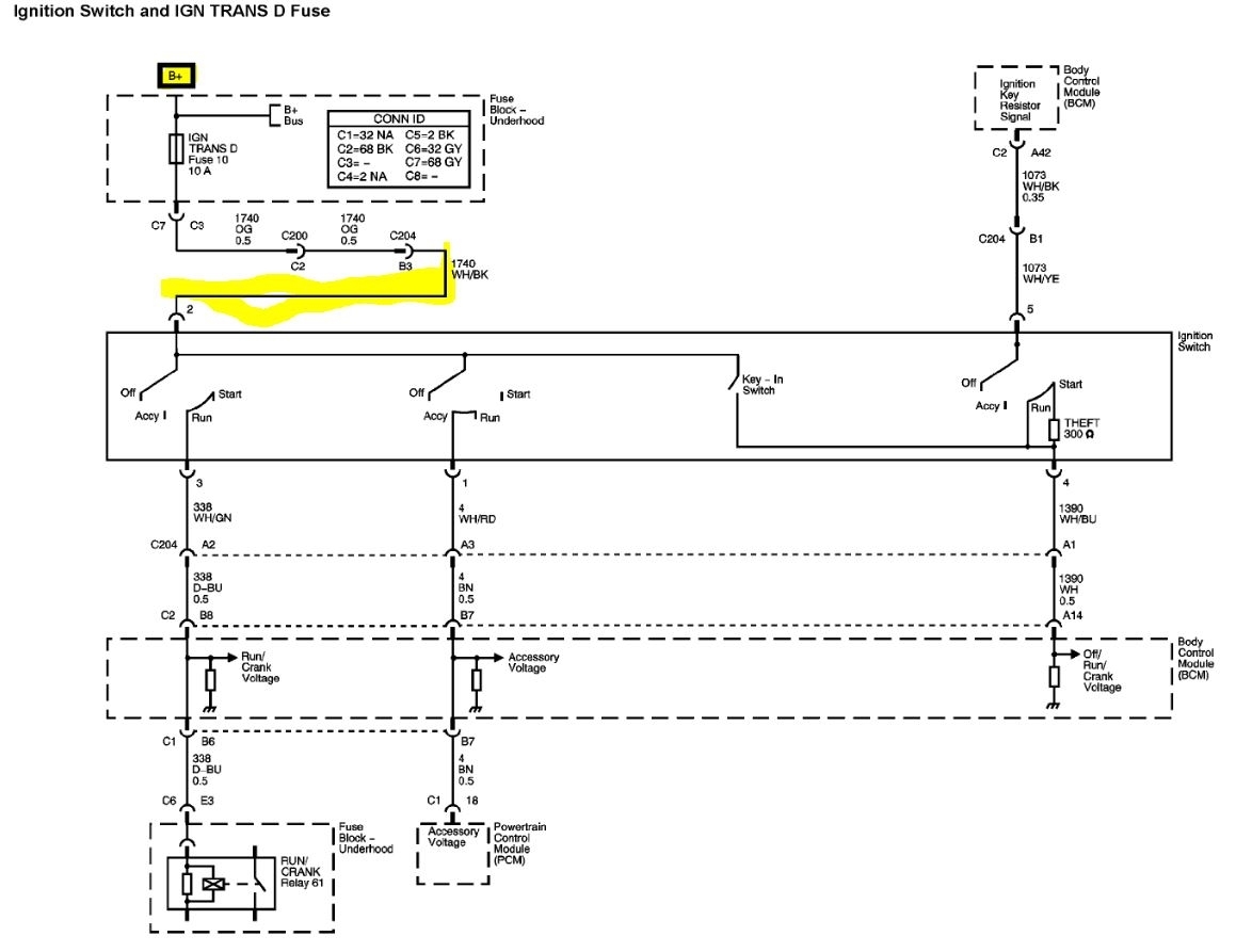 Okay, that means it at least is seeing the key as valid. Now we need to figure out why the switch start signal isn't getting to the relay. For that, verify that the start pin 3 on the switch is sending battery voltage when you turn it to start. If it does then go to the Body Control module and verify that the same signal is there on pin B8 in connector2 If it is then great, if not then that wire is open someplace. If it's good then check pin B6 in connector number 1 for the same signal. If its there good, if not then the BCM has an internal problem as they should be linked. From there it goes out to the start relay. If no signal at the relay the wire has an issue.