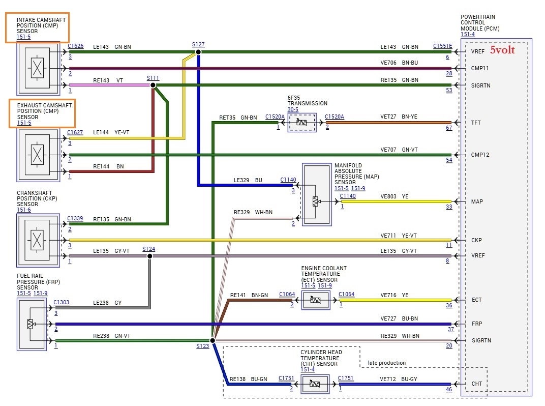 Here are the oem Cam and Crank wiring diagrams (diagram 1) and the PCM connectors and their pinouts. The 2 cam sensors share a 5volt reference which is also shared with the MAP sensor.