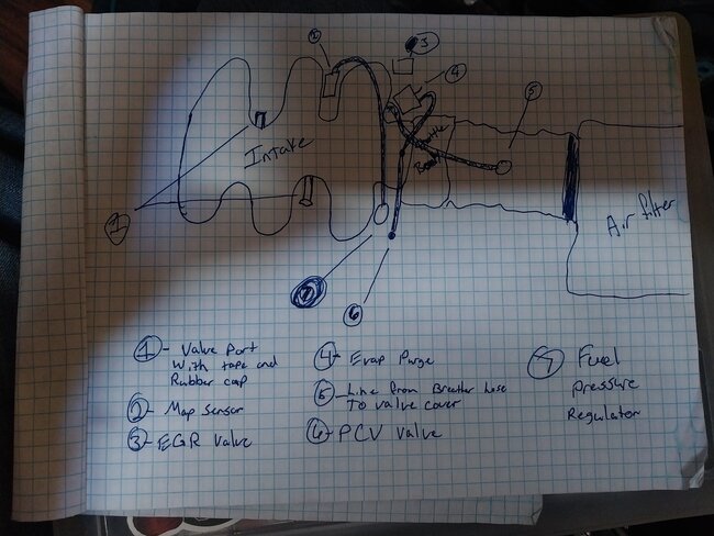 Okay, my jumbled chaos of a car does not appear to be right even remotely according to this. It all started with a random temperature gauge spike and the heater quick working car started to overheat my wife started playing with the defrost/heat/vent/ac/bi-level switch and weirdly heat started to blow and the temp gauge went down no more problems for about 10,000 miles then it started again same scenario heat stop blowing warm air and cat overheat. Play with the switch and hit and miss sometimes it works sometimes it don't then that stopped, and it just overheats bad now. Well I changed the thermostat, water pump, noticed a crack in the plastic of the radiator on driver side below the hose so changed the radiator, the engine coolant temp sensor, intake manifold gaskets noticed the intake manifold was cracked so replaced it , now it don't read hot and the heat started working but boy dose it overheat and build mad pressure so I hallowed out the catalytic converter and that helped a little but I will occasionally see damp spot in passenger floorboard but not often and get that smell so heater core is next . But on those vacuum lines they don't connect like that I'll upload a diagram of what is actually there in the car connected and add pictures. I appreciate any help and advice.