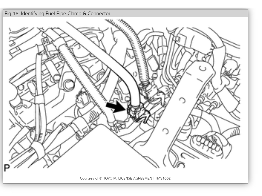 Stop the Engine and continue to observe pressure. Should hold a minimum of 21 PSI for 5 minutes. If pressure drops, inspect hoses, connections, fuel pump and injectors for leaks.