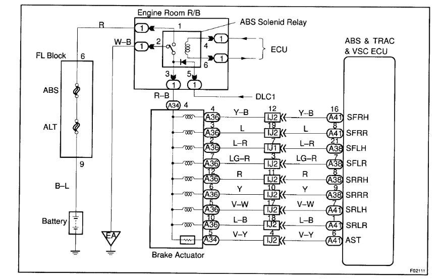 If trouble occurs in the actuator solenoid circuit, the ECU cuts off current to the ABS solenoid relay and prohibits ABS & TRAC & VSC controls and the brake system becomes normal.