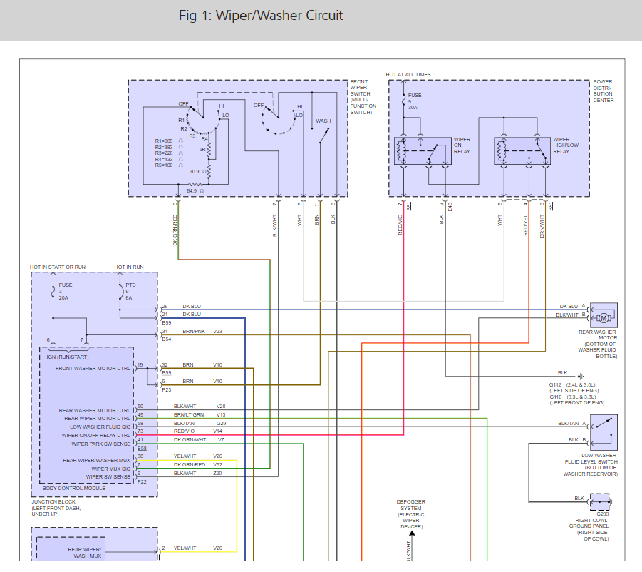 My problem is the front windshield wipers will not work. I have checked fuse under dash and in fuse/relay block under hood; both okay. Replaced multi-switch: wiper, washer, bright lights, turn signal. Replaced both relays under hood. At the wiring connector for the wipers under hood I am able to get wipers to run by jumping from the positive battery post to the brown wire with white stripe