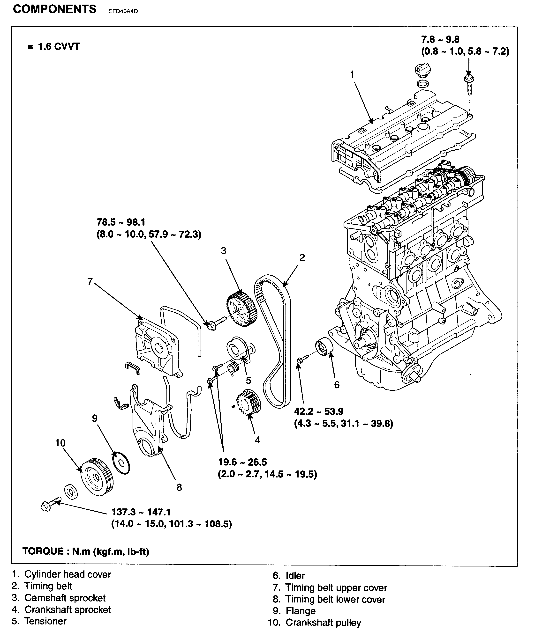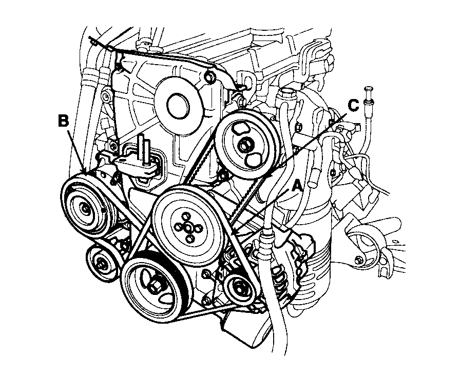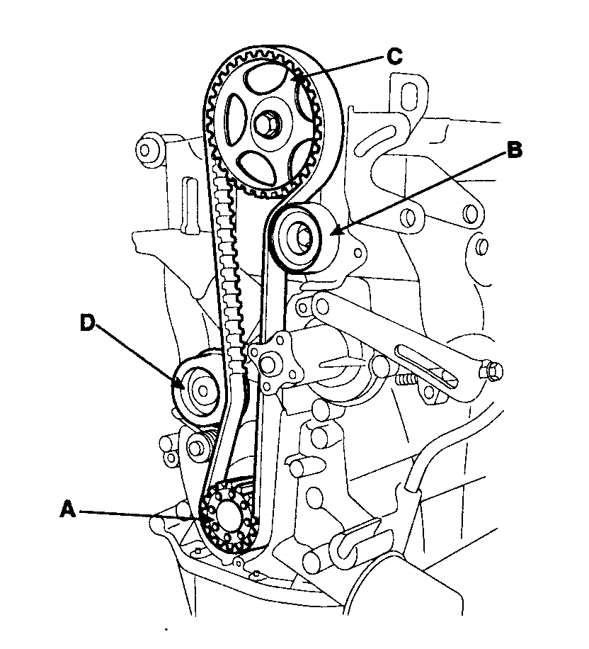 Crankshaft sprocket(A) >idler pulley(B) >camshaft sprocket(C) >timing belt tensioner(D).