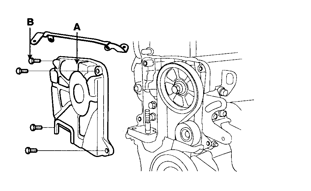 9. Remove the 4 bolts(B) and timing belt upper cover(A).
