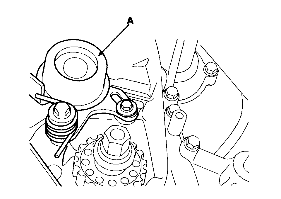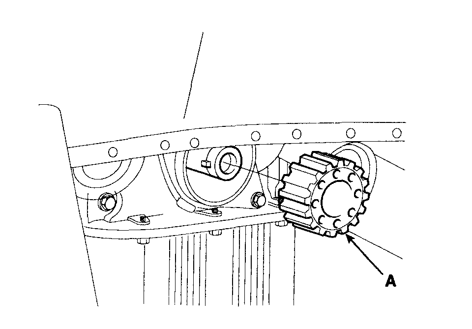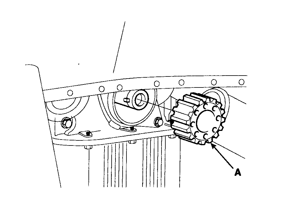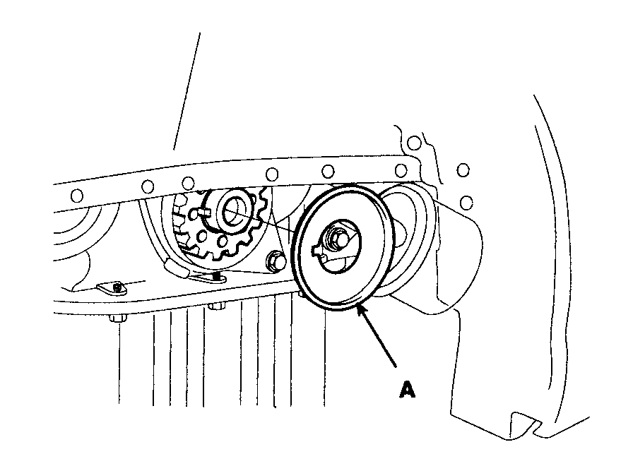 11. Install the flange and crankshaft pulley(A), and then tighten crankshaft pulley bolt. Make sure that crankshaft sprocket pin fits the small hole in the pulley.