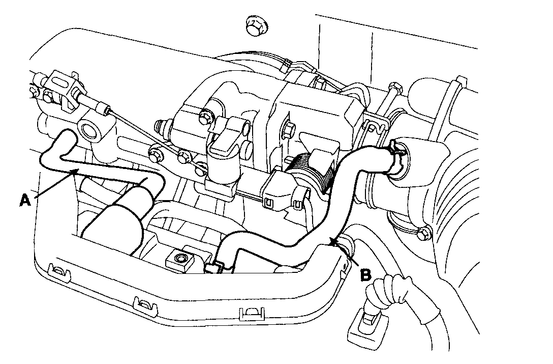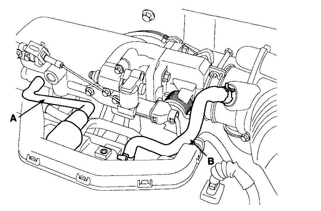 3) Remove the PCV (Positive Crankcase Ventilation) hose(A) and the breather hose(B) from the cylinder head cover.
