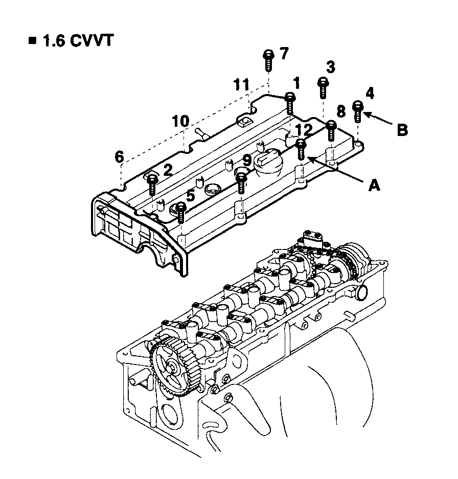 5) Loosen the cylinder head cover bolts(B) and then remove the cover(A) and gasket.