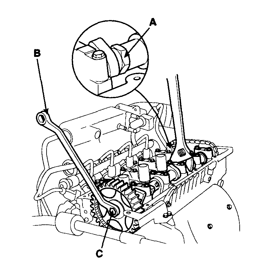 1) Hold the portion(A) of the camshaft with a hexagonal wrench, and remove the bolt(C) with a wrench(B) and remove the camshaft sprocket.