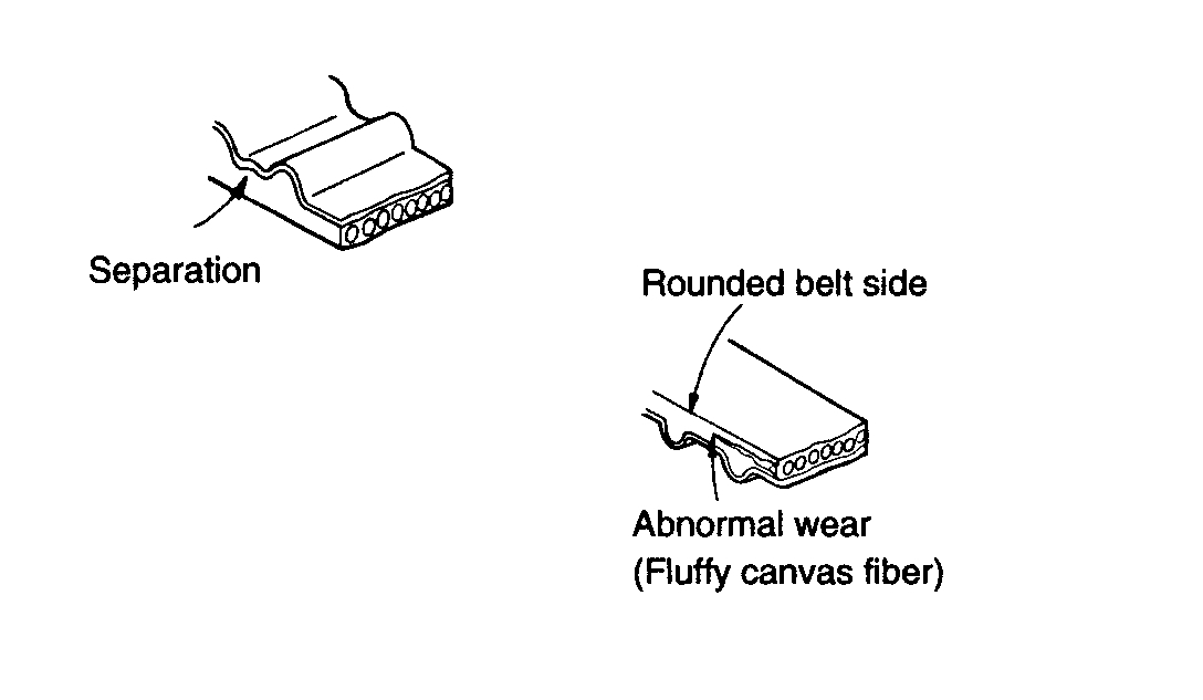 2. When the engine is overhauled or belt tension adjusted, check the belt carefully. If any of the following flaws are evident, replace the belt.