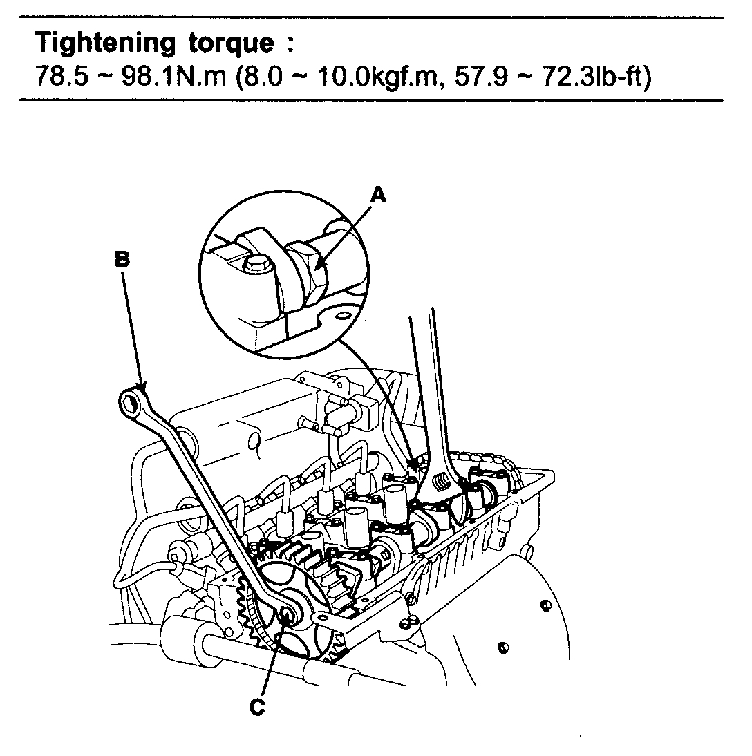 2) Hold the portion(A) of the camshaft with a hexagonal wrench, and tighten the bolt(C) with a wrench(B).