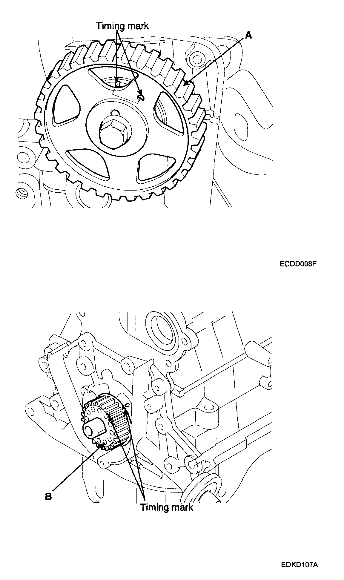 4. Align the timing marks of the camshaft sprocket(A) and crankshaft sprocket(B) with the No.1 piston placed at top dead center and its compression stroke.