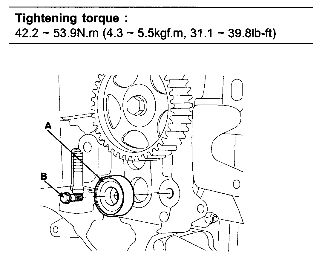 5. Install the idler pulley(A) and tighten the bolt(B) to the specified torque.