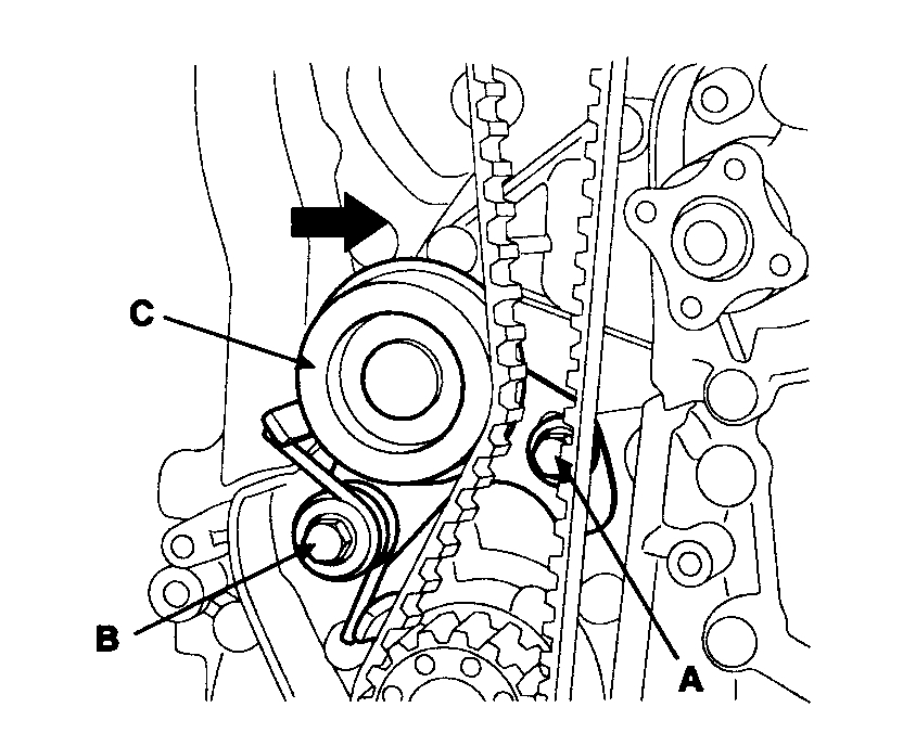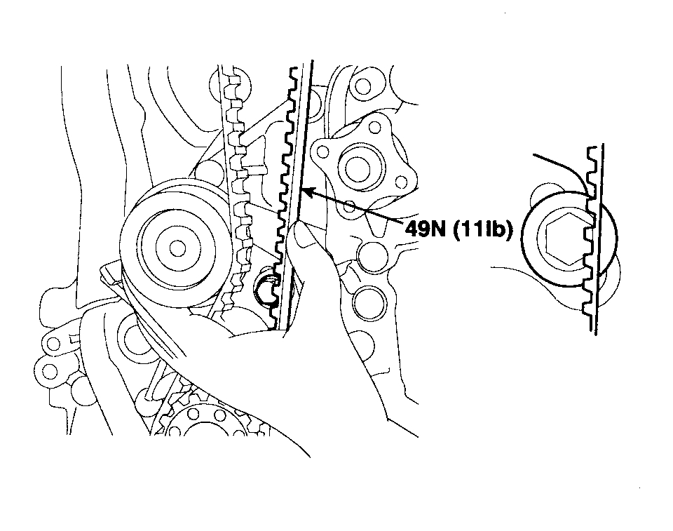 Verify that when the tensioner and the tension side of the timing belt are pushed in horizontally with a moderate force [approximately. 49N (11lb)], the timing belt cog end is aprox. 1/2 of the tensioner mounting bolt head radius (across flats) away from the bolt head center.