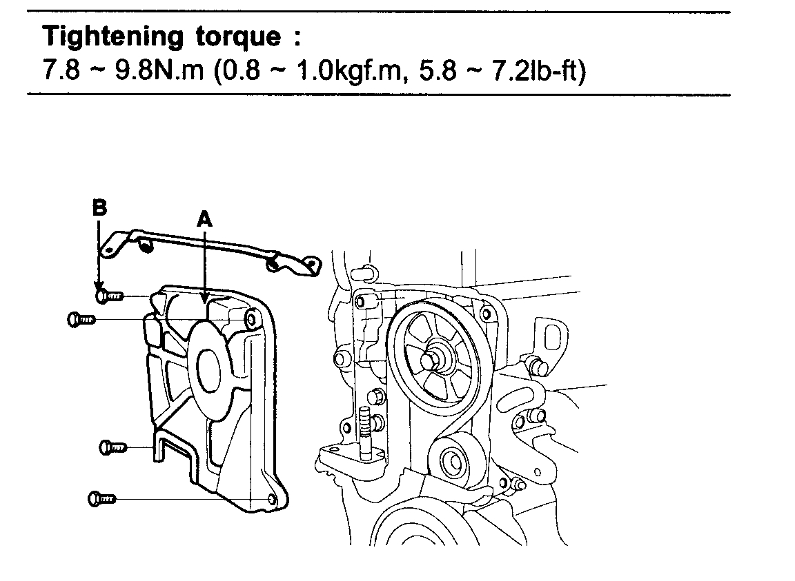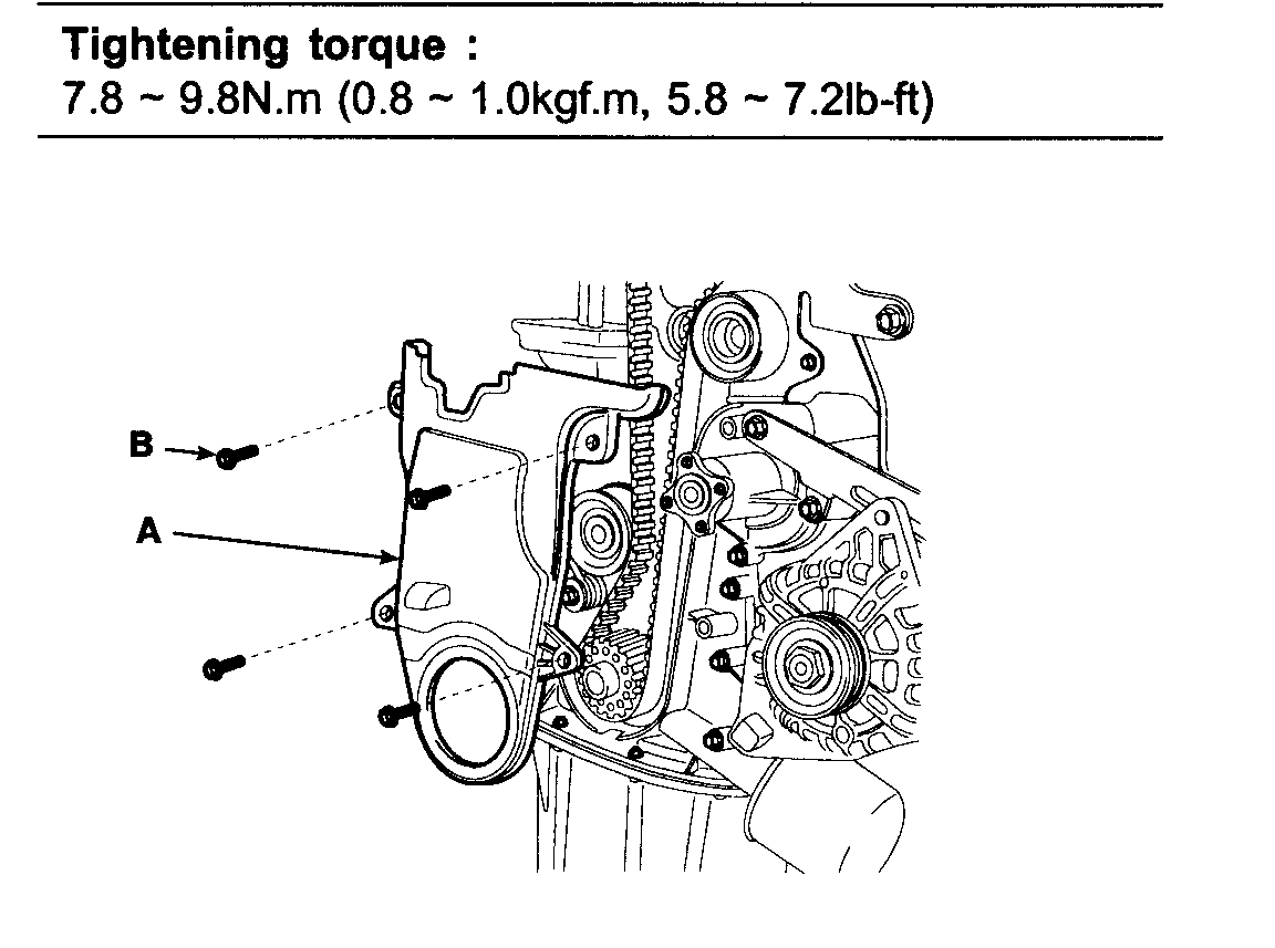10. Install the timing belt lower cover(A) with 5bolts(B).