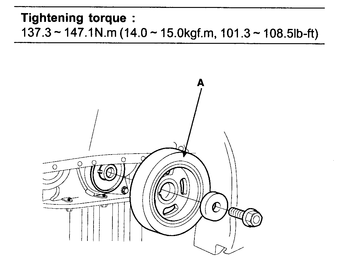 Tightening torque: 88.3 - 98.1N.m (9.0 - 10.0kgf.m, 65.1 - 72.3lb-ft)