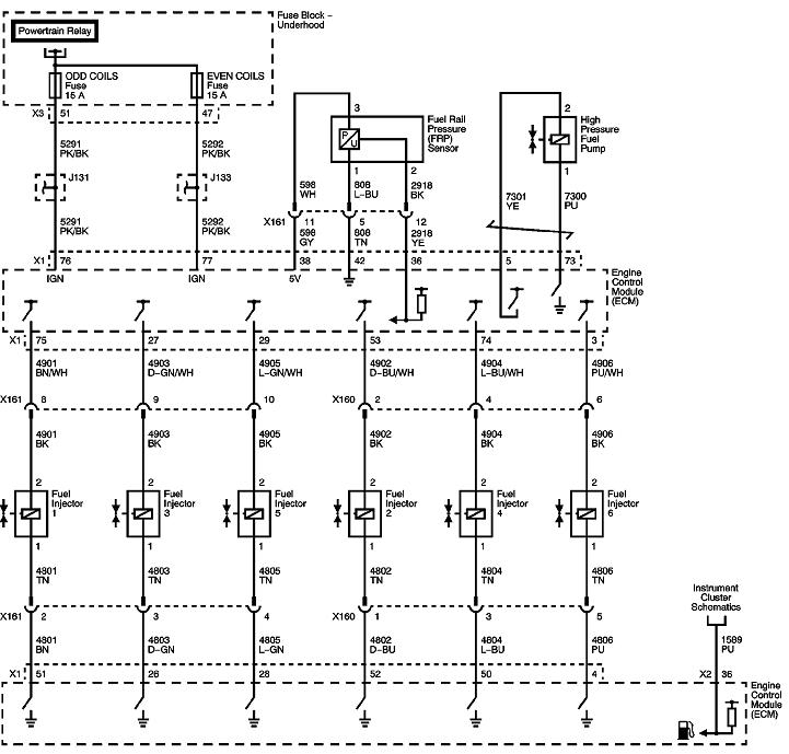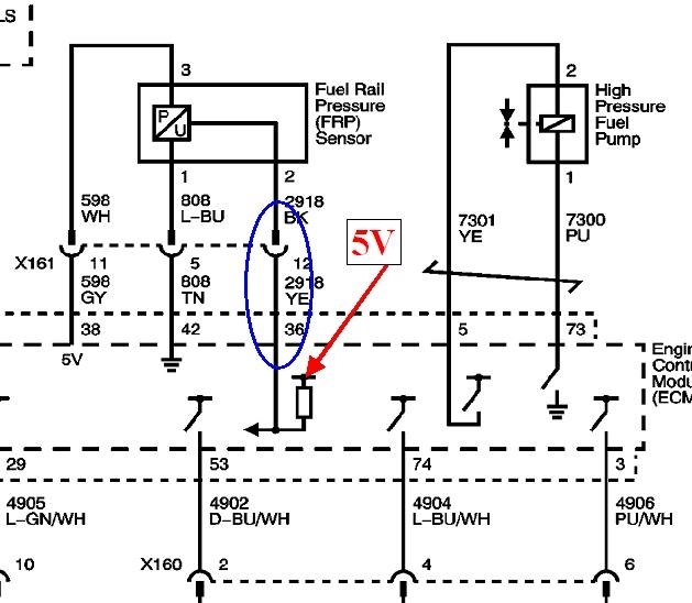 The diagram below is one of the power train management diagrams, and since it's so hard to read, I enlarged that part of it with the fuel pressure sensor. The secret to setting fault codes is the use of a "pull-up" or "pull-down" resistor. When you have a break in the signal wire, in this case, the part in the blue circle, who knows what voltage the computer will see? Due to all the interconnected circuitry inside the computer, the voltage on the signal terminal is going to "float" to some random value. If that happens to be something between about 0.5 and 4.5 volts, the computer will accept it as a normal reading, and will try to run on that. Since the break in that wire is a defective condition, the engineers added, (in this case), a pull-up resistor inside the computer. It's tied to the 5.0 volt source internally. The value of this resistor is so extremely high that under normal conditions it has no effect on circuit operation. It's when the signal wire circuit has a break that the 5.0 volts is applied to the signal terminal, through that pull-up resistor, to force it to go to a defective condition and get detected. That's where your fault code is coming from.
