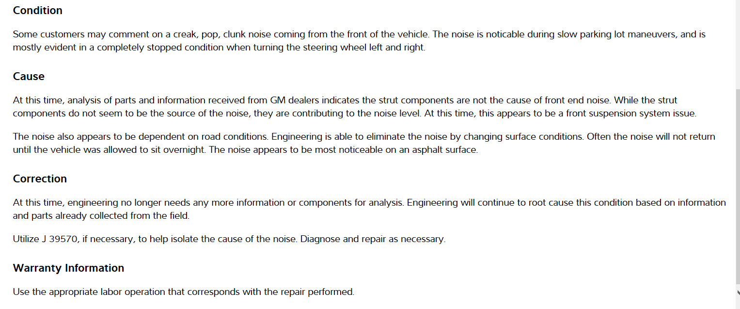 have a pro check the front end , might be ball joints or the plate on top of strut quit replacing parts and costing you money for good parts that don't need to be replaced. see pic this is a tsb and really they use a sound meter hooked to your suspension to isolate the cause as GM doesn't know where it comes from either.