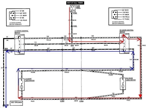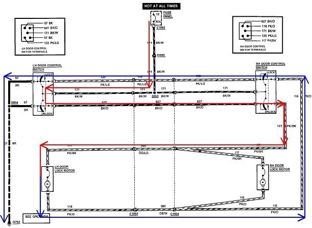 I traced the current path for locking from the passenger's switch. If you follow my nifty red arrows from the circuit breaker, down to the top of the right switch, the top part is moved away from its at-rest position, (which was grounded), to the 12-volt feed contact. Current follows the red arrows to both lock motors. All the 12 volts is dropped across the motors, so from now on we're on the ground side. There should be 0 volts the rest of the way. Those are the blue arrows. Current for both motors goes back to the second part of the passenger's switch which is released, through that, over to the driver's switch, through one of the released contacts in it, then to ground.