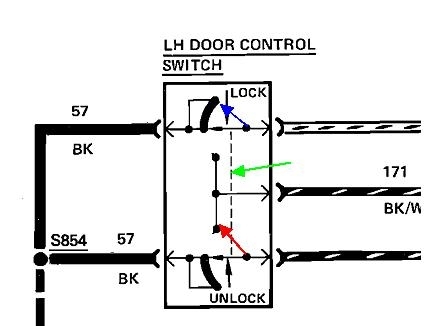 The second drawing is of an enlarged driver's switch. The dashed line, (green arrow), indicates the two switches move together when you press the lever. This is shown being pressed for "unlock". For the top part, the movable contact, (blue arrow), has simply moved from one point to another along that curved black strip. That is a ground contact, and electrically-speaking, nothing has changed there between the switch released or the switch pressed.