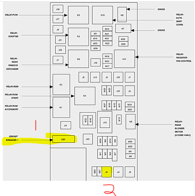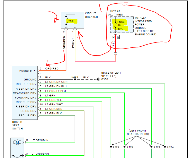 Power to the driver's seat depends on two things. First, fuse J8 in the under-hood fuse box (40 amp), provides power to a 25-amp circuit breaker. That sends power to the seat switch.