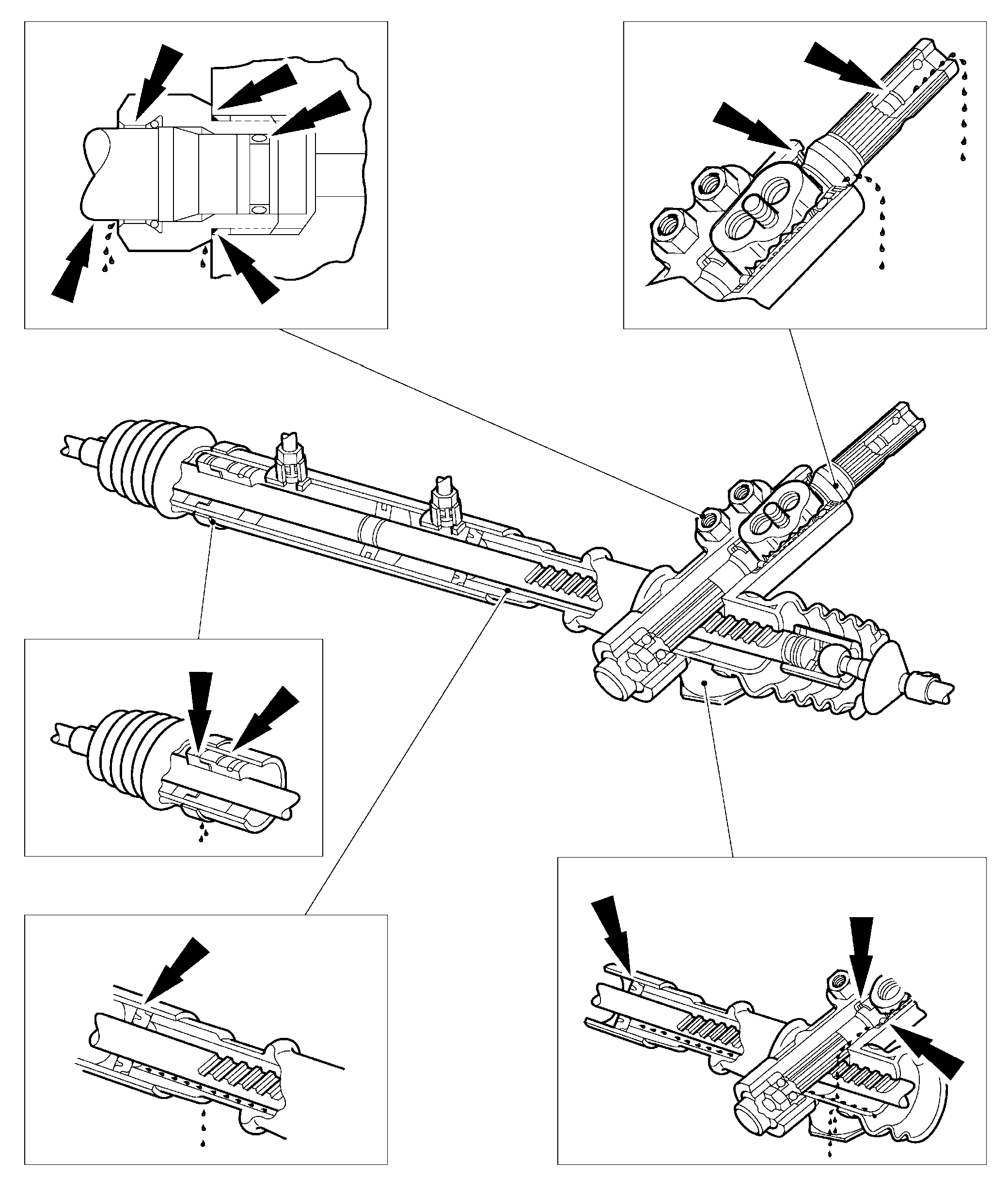 6. Inspect the power steering gear for leaks. If a leak is detected at the power steering gear, install a new power steering gear.