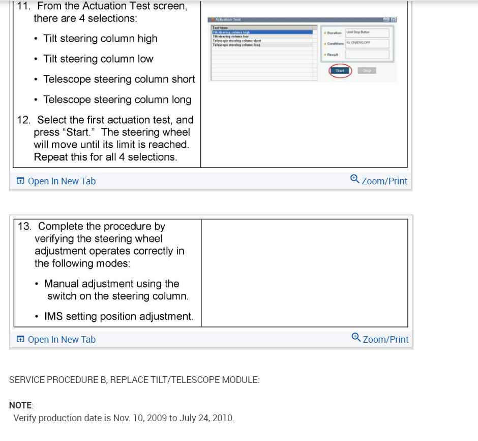 Use Service Procedure B (for vehicles produced November 10, 2009 and later) to replace tilt/telescope module.