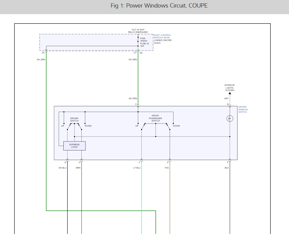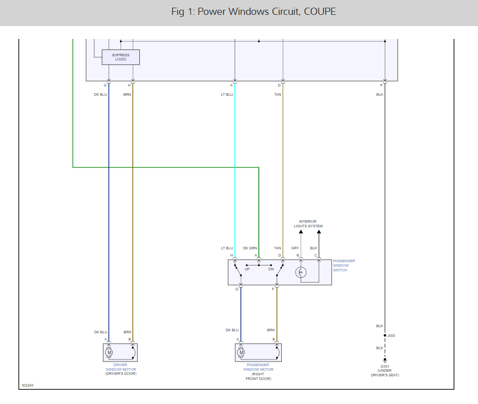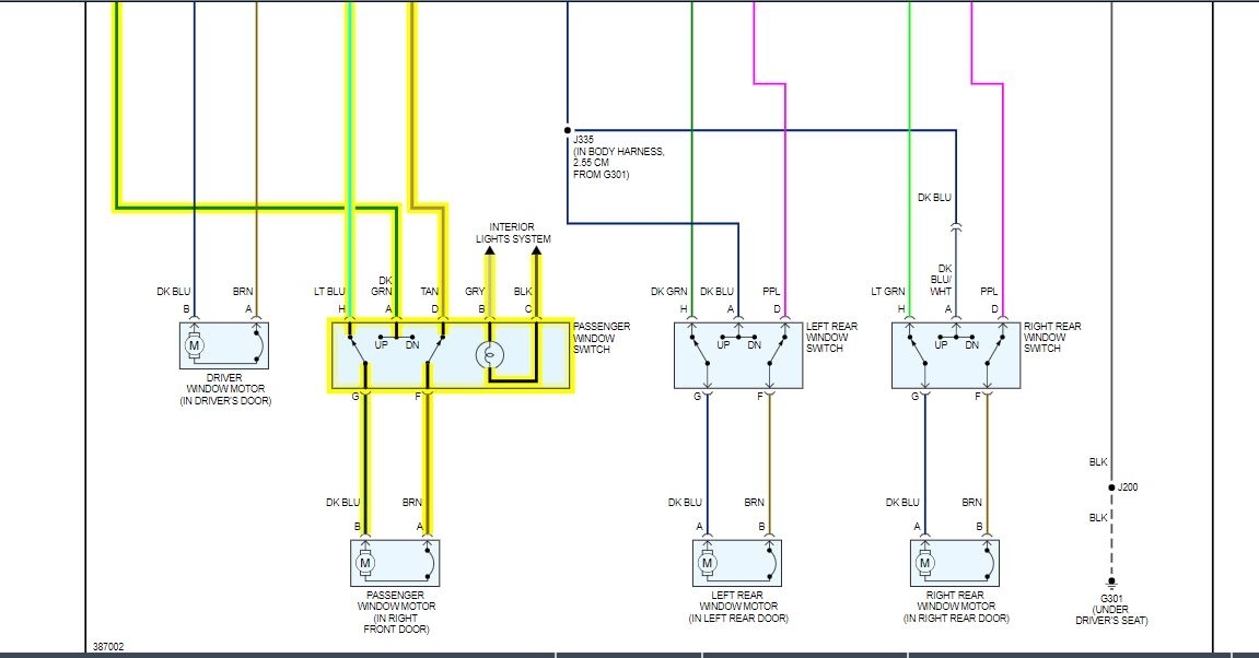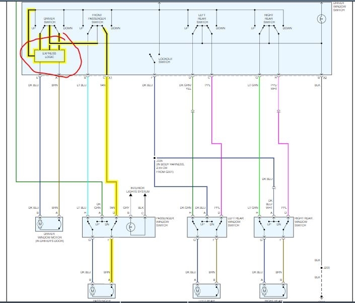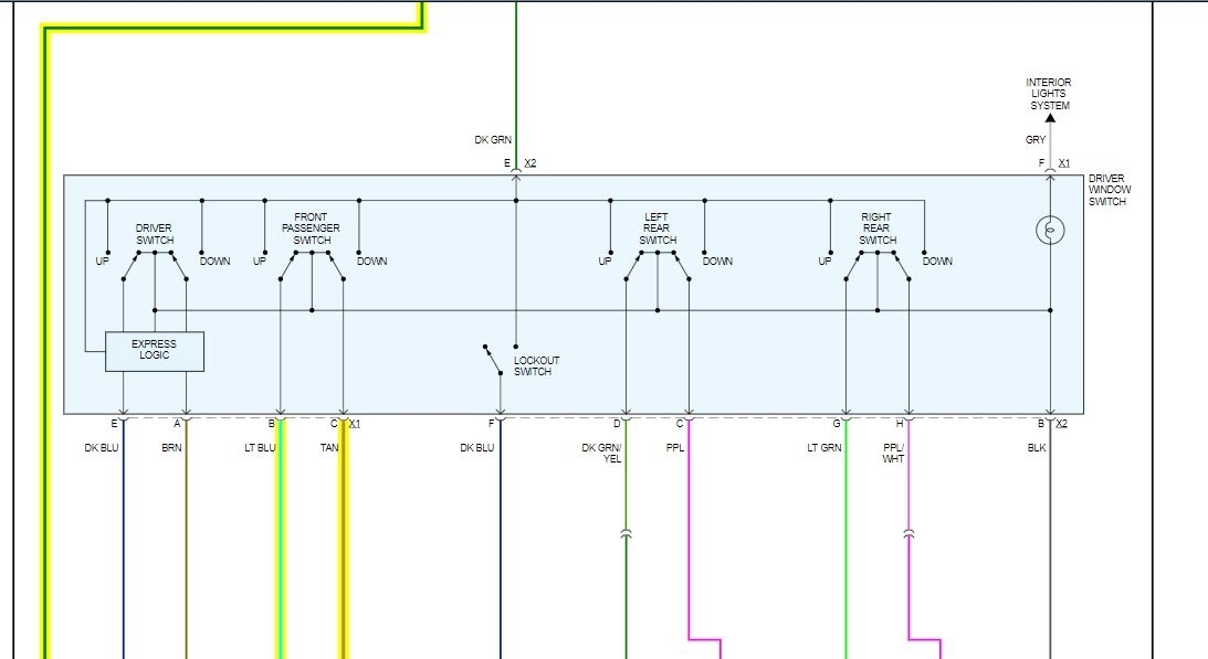 Passenger side power window will go down but not up using either the driver's master switch or the passenger switch. Window will go up and down if I connect the motor directly to the battery. Replaced the passenger door switch with new one. Still won't go up with the new switch.
