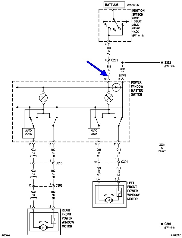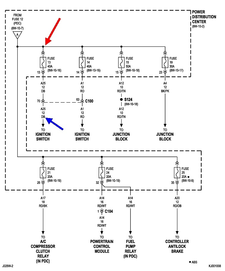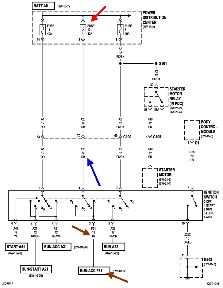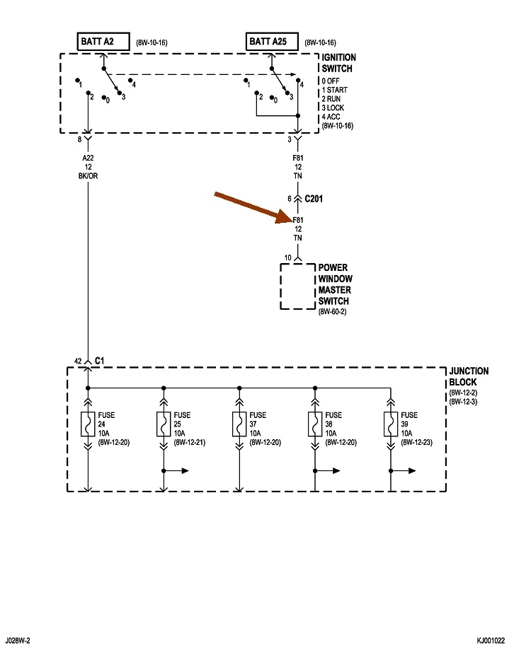 Dandy. We're at the brown arrow in the third diagram, and there's 0 volts there. The easiest place to get to as we work our way back toward the fuse is at the connector for the ignition switch. That connector is shown in the fourth drawing. There's no specific instructions on how to get to the connector other than to remove the lower steering column cover.