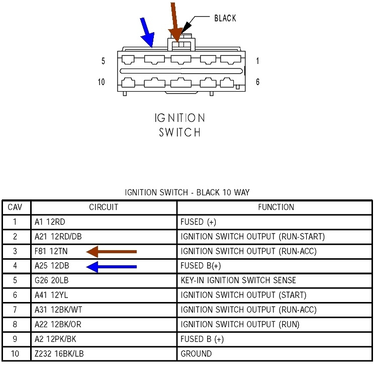 The connector is shown looking at the terminal end with the wires coming out on the back side. Look for the blue and tan wires. They'll be right next to each other. Back-probe those with the test light. There should be 12 volts on the blue wire all the time, and there should be 12 volts on the tan wire only when the ignition switch is in the "run" or the "accessory" positions.