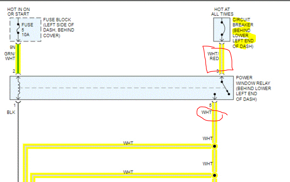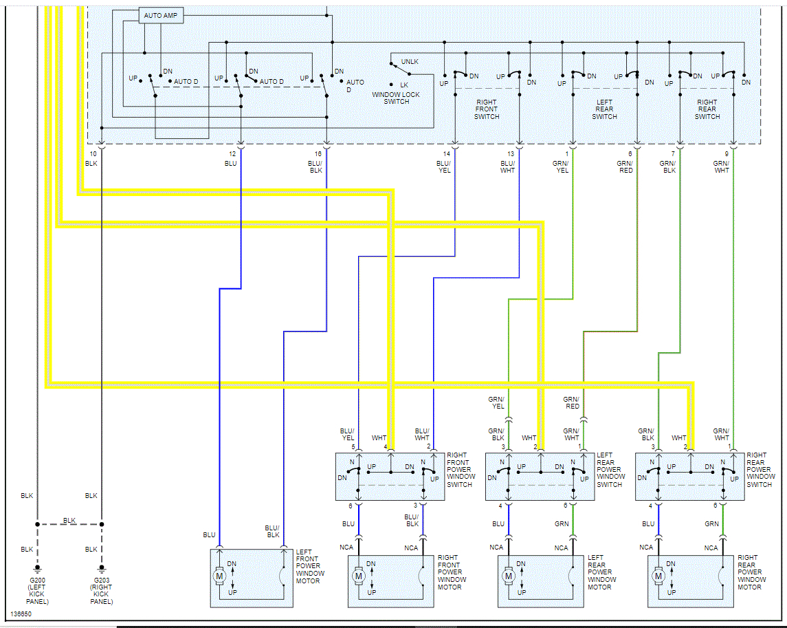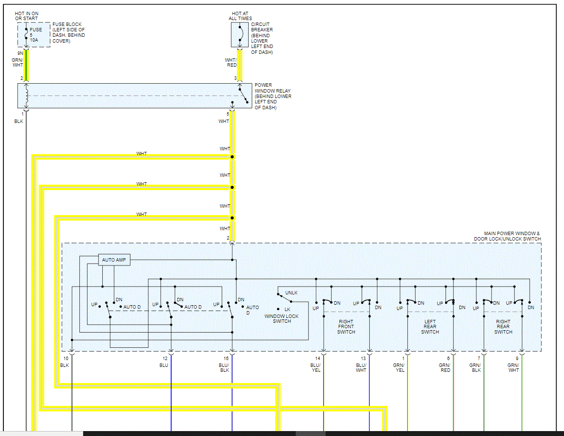I have no power to any windows from any window. Have checked relay, fuses. What I need to know is the color of the wire that supplies power to the main switch of drivers door. (Harness between body and door)
