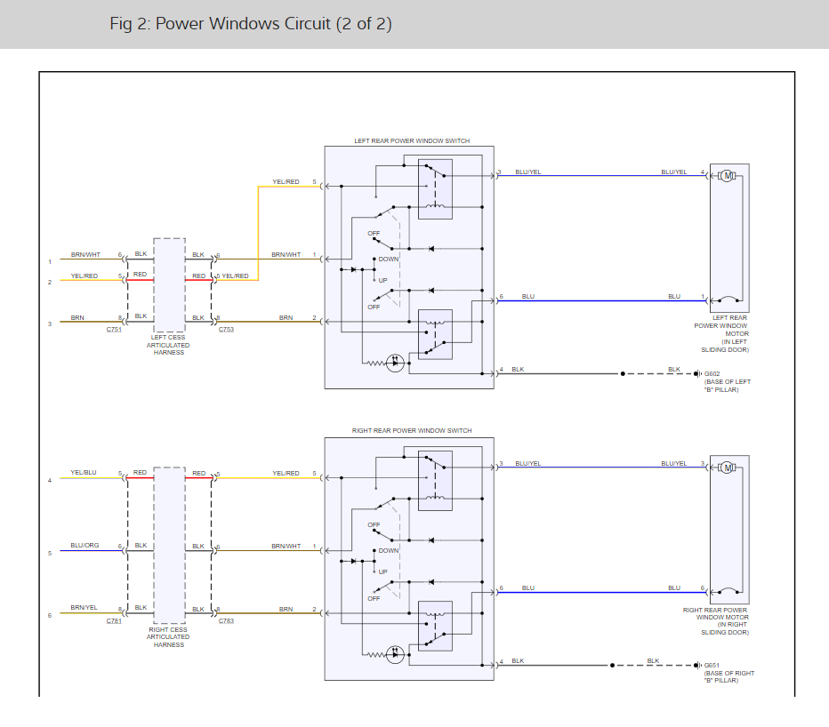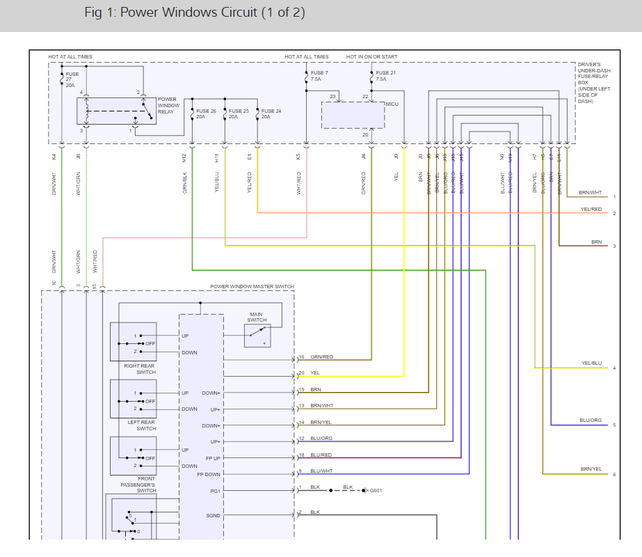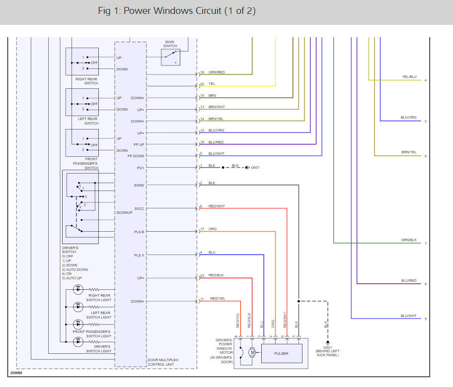 You can test the power and ground with the window control output by using this guide and the window wiring diagrams below so you can see how the system works:
