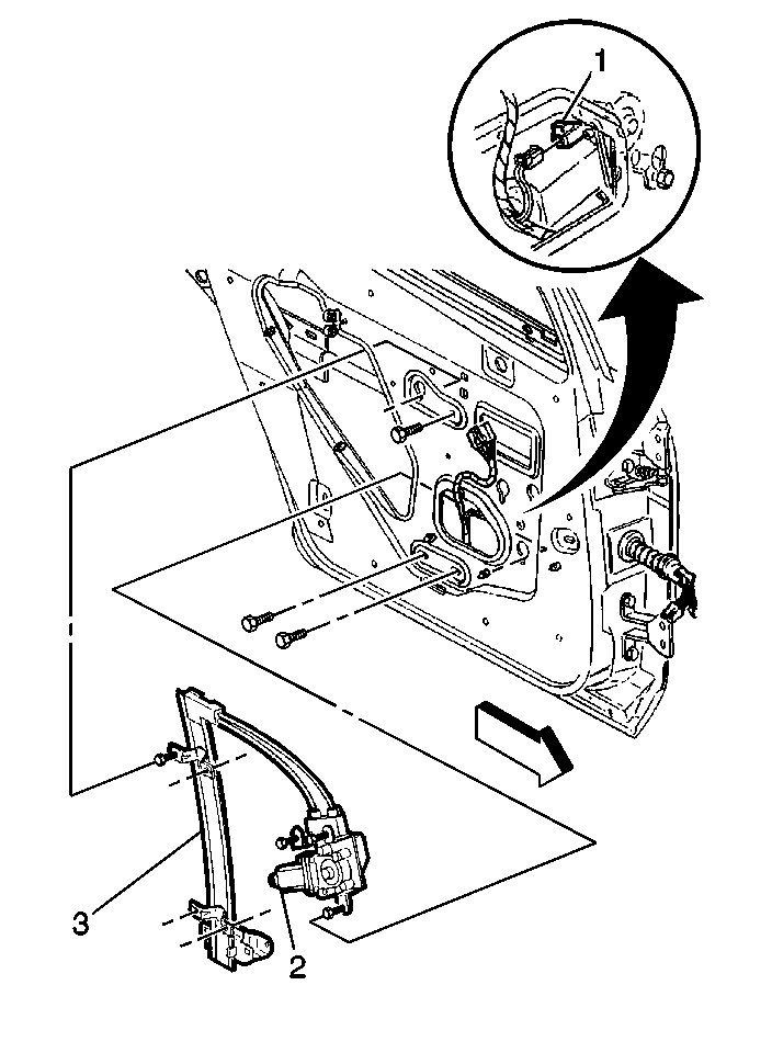 3. Position the rear door window regulator motor inside the rear door and install it into the key slots in the inner door panel.