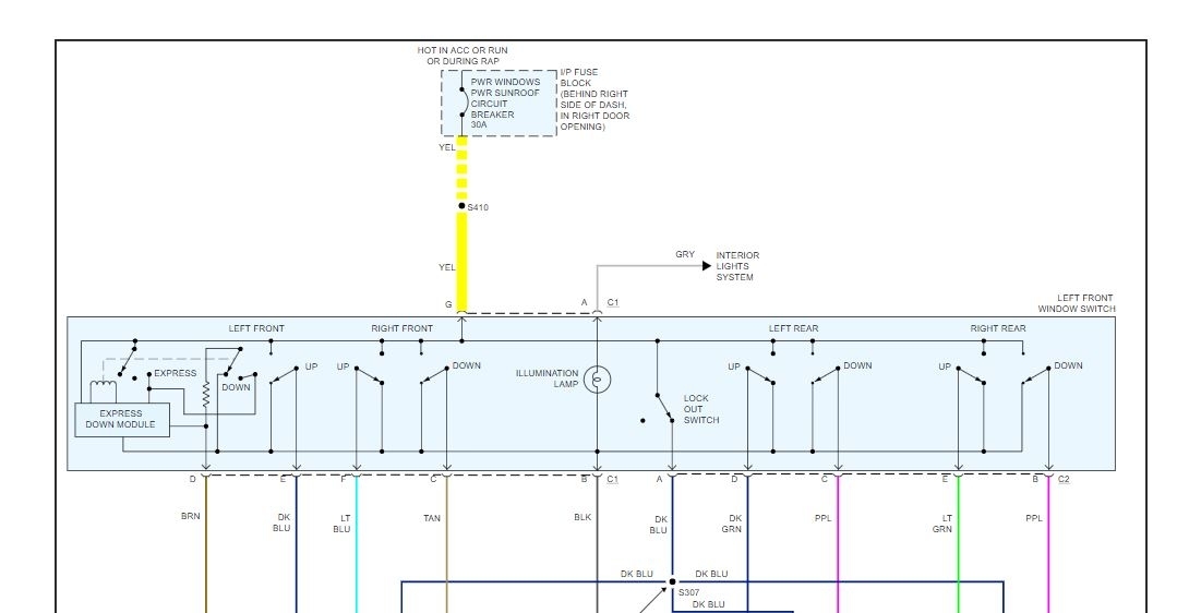 CAUTION: Disconnect the power window switch when working inside the driver door. When operated, the Express Up/Down Feature allows the door window to move very quickly, without stopping, which could cause personal injury.
