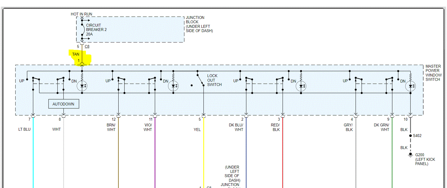 Also, if you look at pic 2, I highlighted the wire which provides power at the main switch (driver's door). The first thing I would check is if that has 12v power to it.