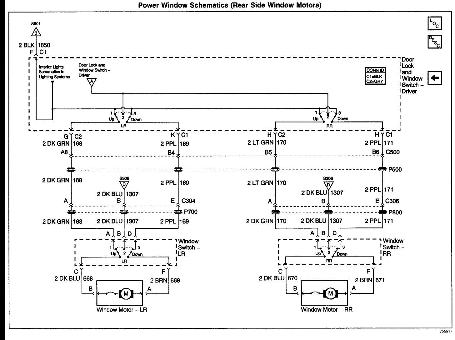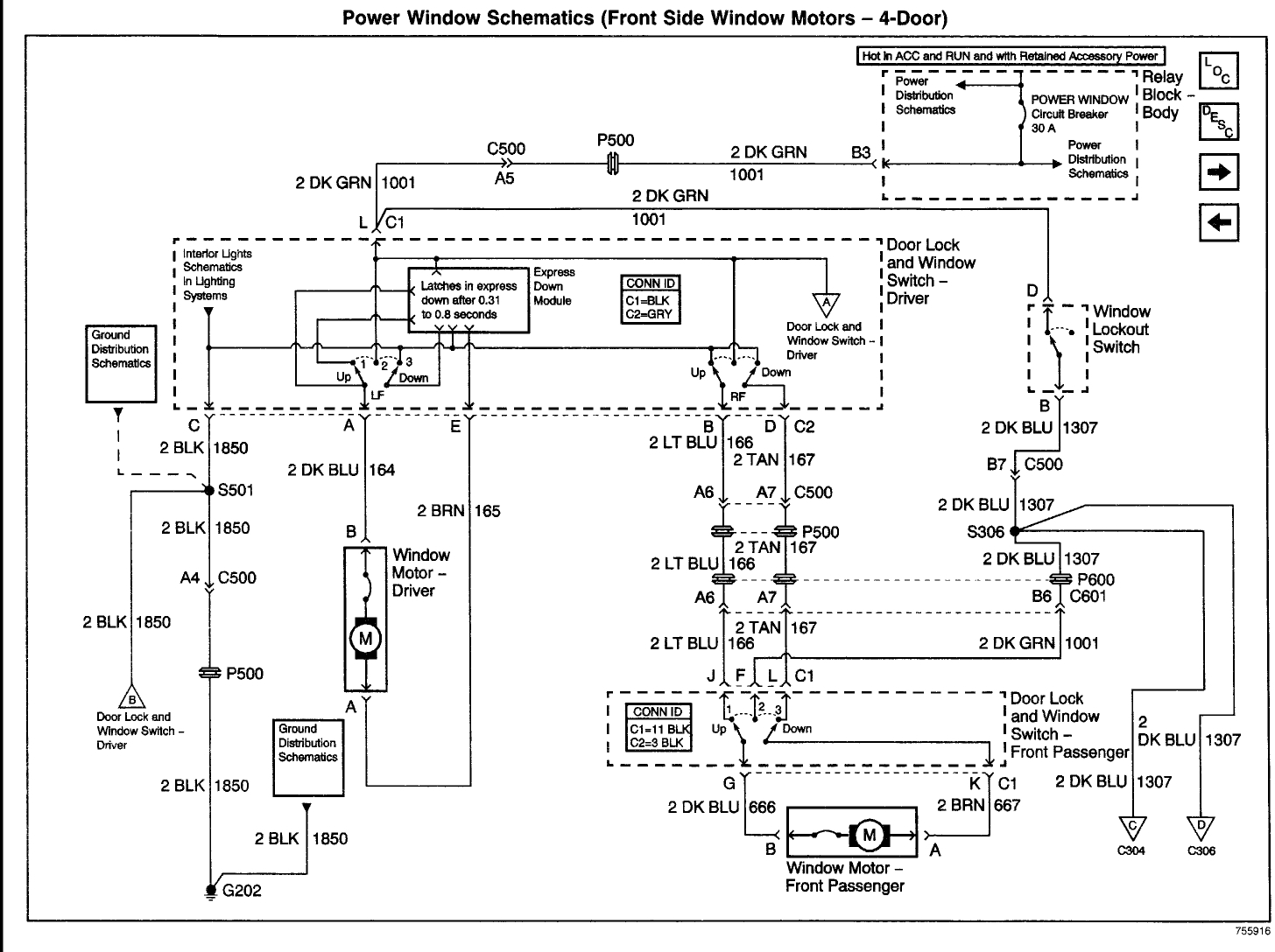 The attached show the circuits. Primary power for all four windows is the dark green wire.