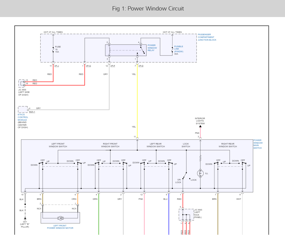 There is a P/wdw fusible link that we need to check. here is a window wiring diagrams below so you can see how the system works. I have included the link location as well and how to check it.