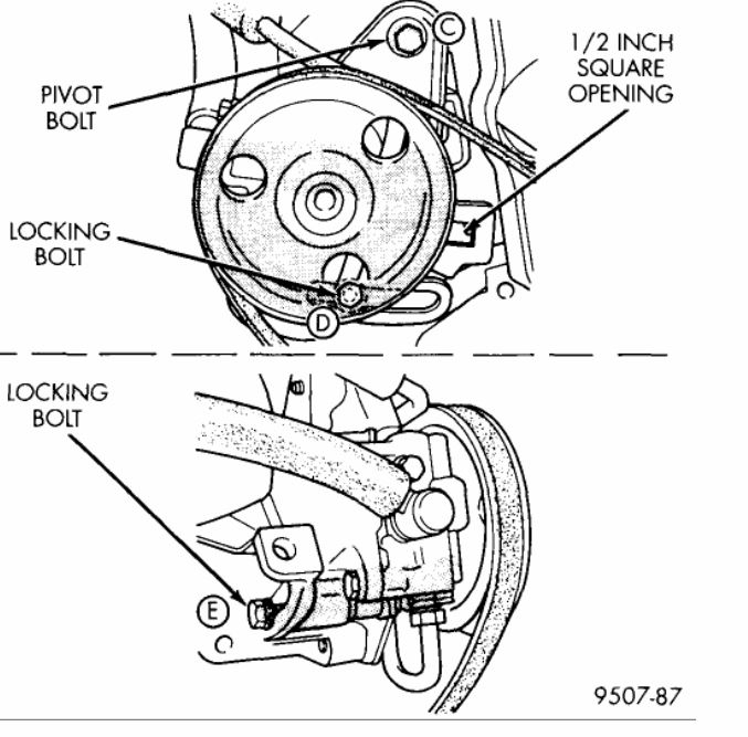 For the power steering belt you will need a long half inch drive breaker bar. It get's inserted into the bracket the pump is mounted on. (image 3) Then loosen the lock bolt and pivot bolt. Use the bar to move the pump so the belt can be installed. Be sure it is seated and then use the bar to apply tension on the belt. While holding the tension you tighten the lock bolt and then the pivot bolt.