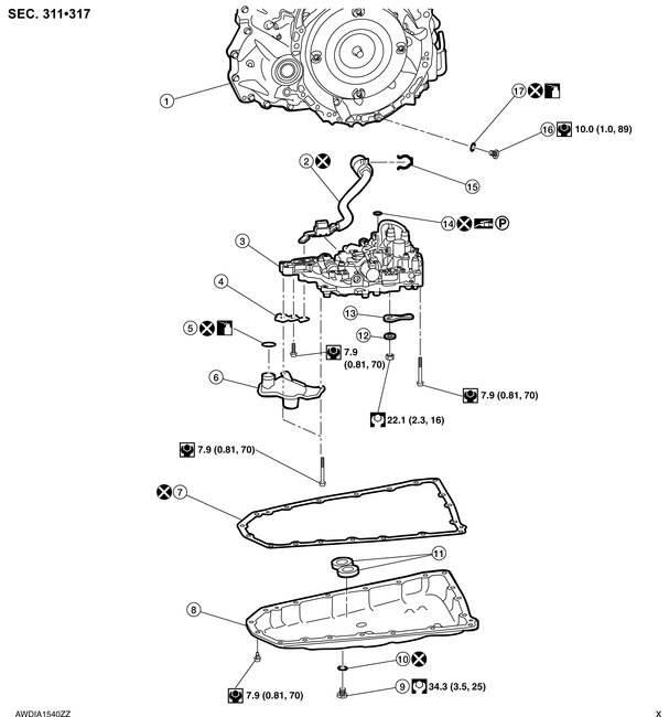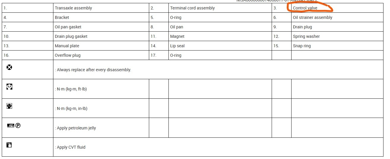 with its configuration data as the replacement part, a used one won't work unless you can access the vehicle it is being removed from and can copy the configuration data from it as a working unit. This is because the data on each solenoid is slightly different and the TCM gets programmed with that data. The mechanical part is simple. Drain the pan of fluid, remove the pan and disconnect and remove the valve body and its harness, clean the surfaces and install the new part with a new filter and harness and follow the torque specs as shown. Refill the CVT with the correct fluid. The hard part is getting the new part and the programming. The part number is Nissan 3170529X0C. The new ones come with a memory stick or a CD with the data used during programming so that the TCM you have can control the solenoids. That data is as important as it being a new part because of the way the CVT wears and operates. You also want to look at the fluid as it comes out. If there is any metal in it it is best to replace the entire CVT.