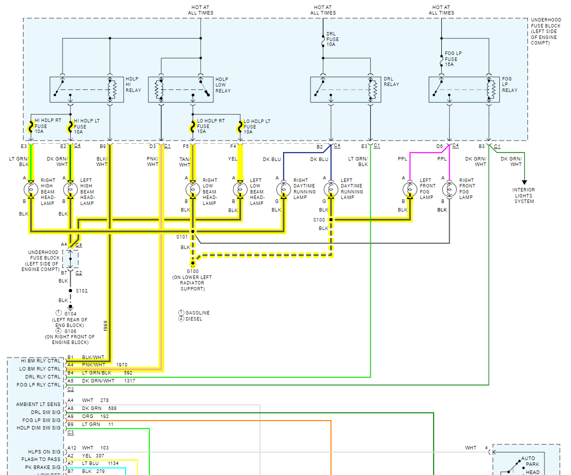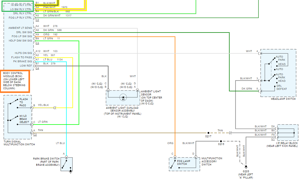 These are the wiring diagrams showing how the BCM grounds the headlamp relays to turn them on: